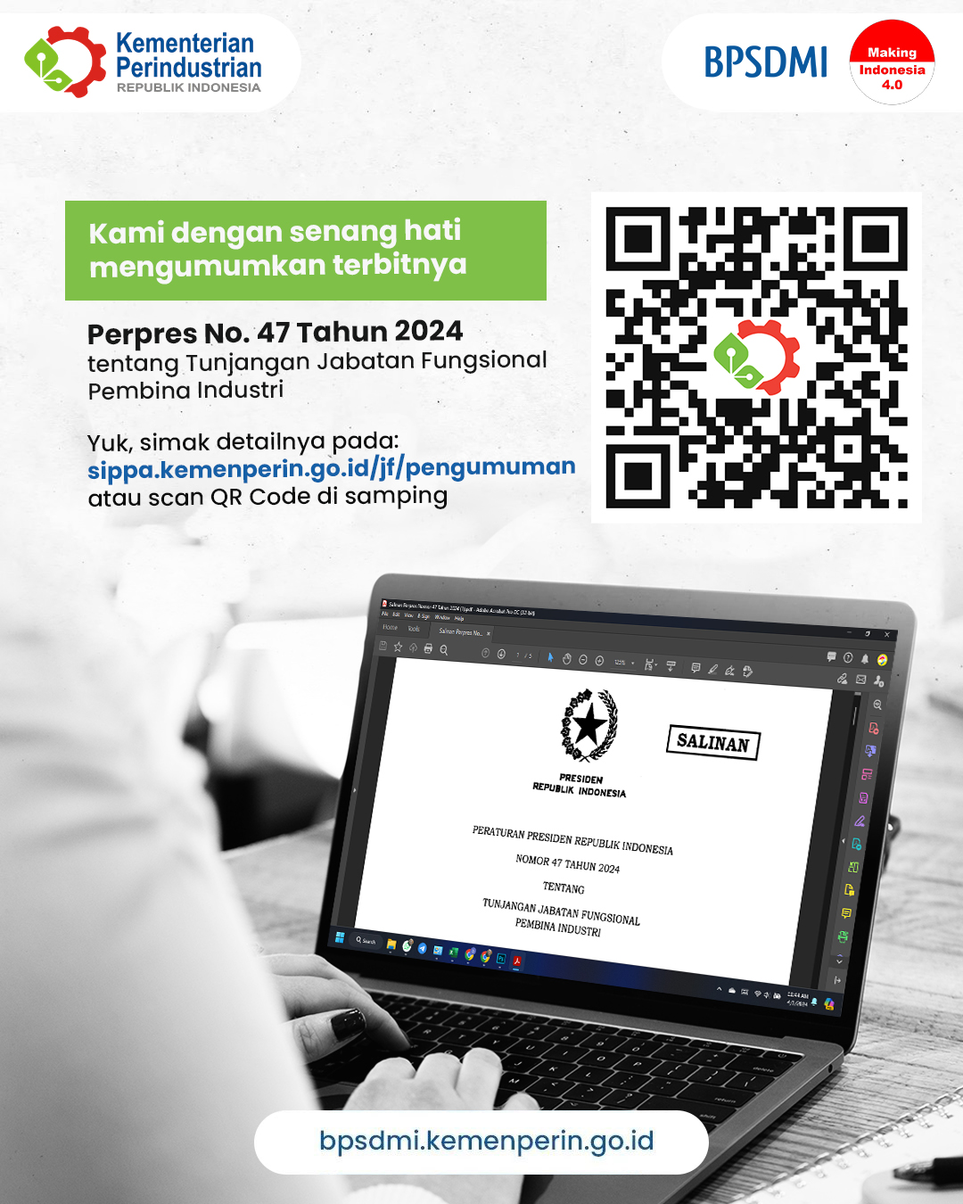 Kami dengan senang hati mengumumkan terbitnya Peraturan Presiden Republik Indonesia Nomor 47 Tahun 2024 tentang Tunjangan Jabatan Fungsional Pembina Industri.